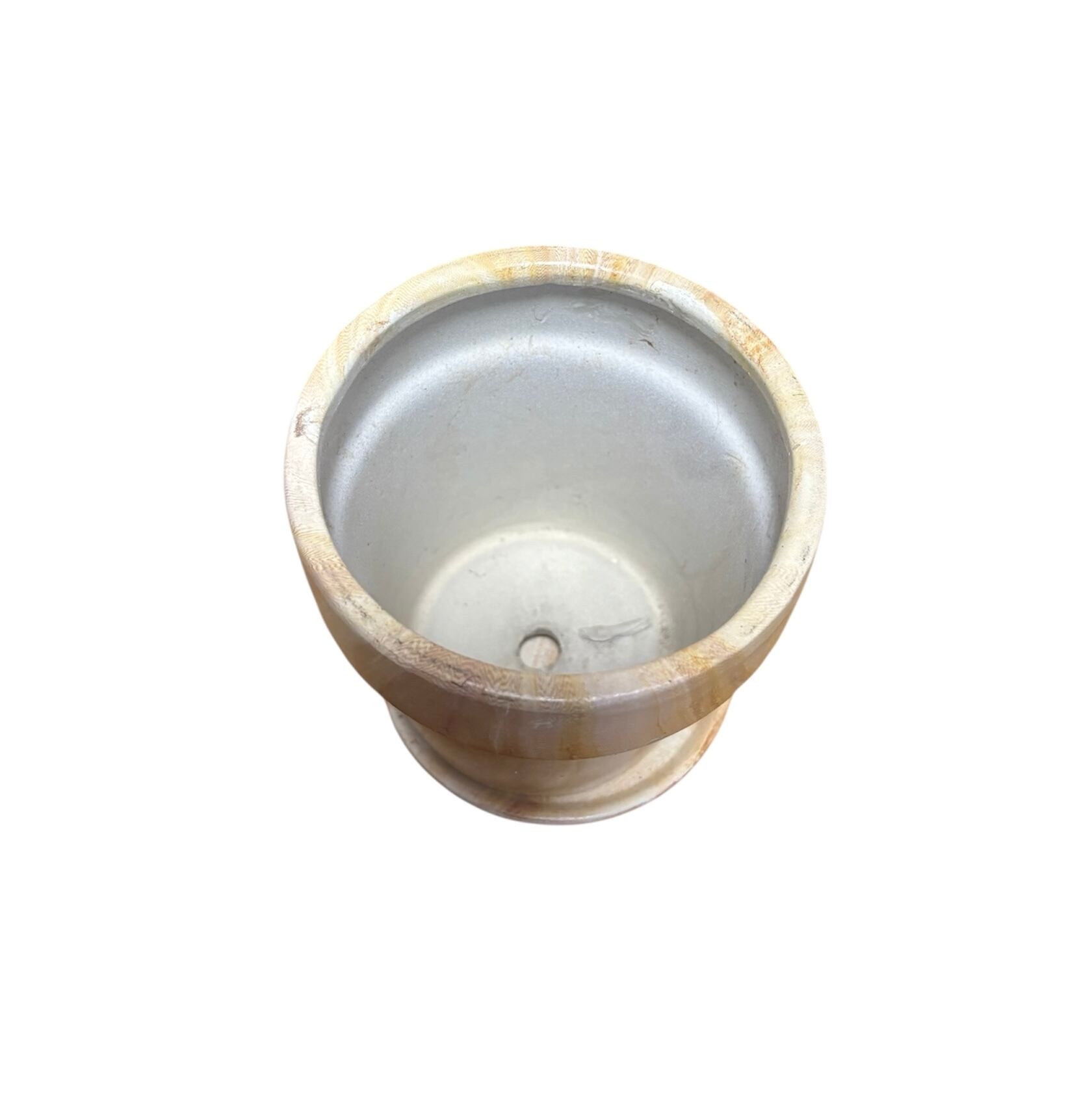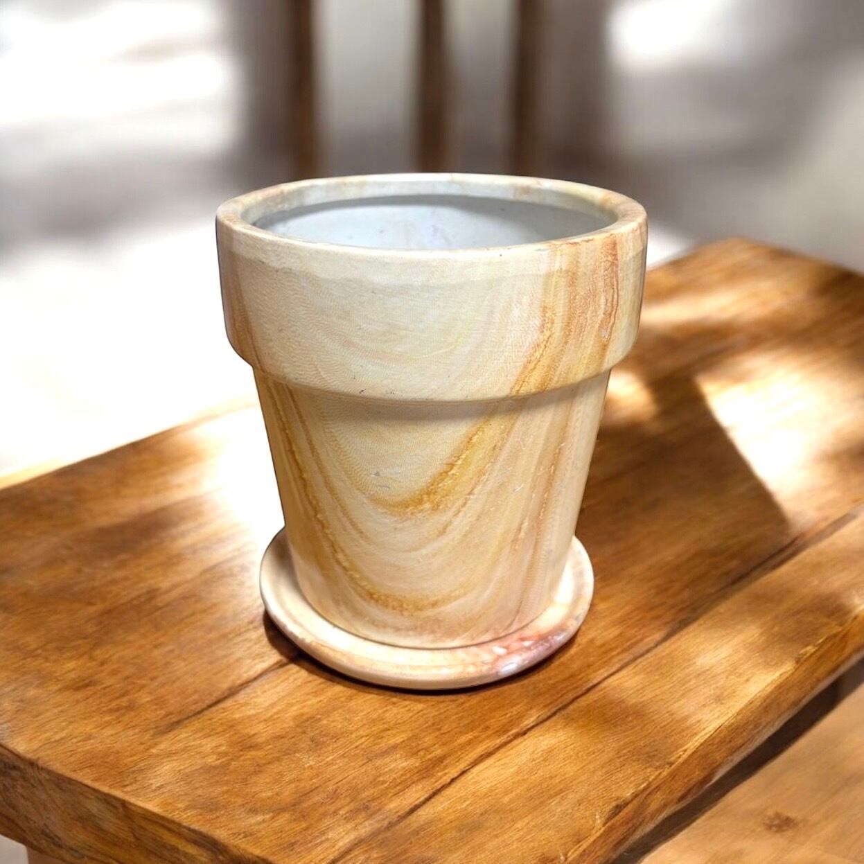 白色とオレンジのマーブルのような色合いが爽やかでオシャレな受け皿付きインテリアポットです。