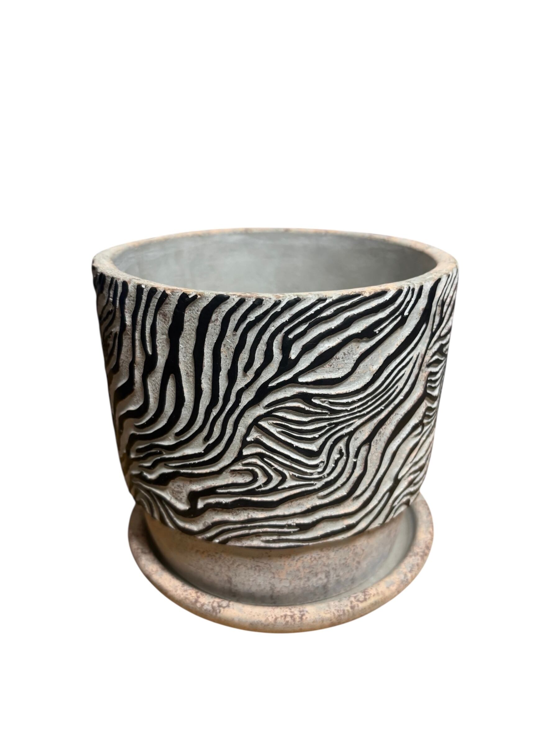 セメント製の植木鉢です。シンブルなデザインにゼブラ柄とのカラーが施されインパクトのある見た目に仕上がっています。