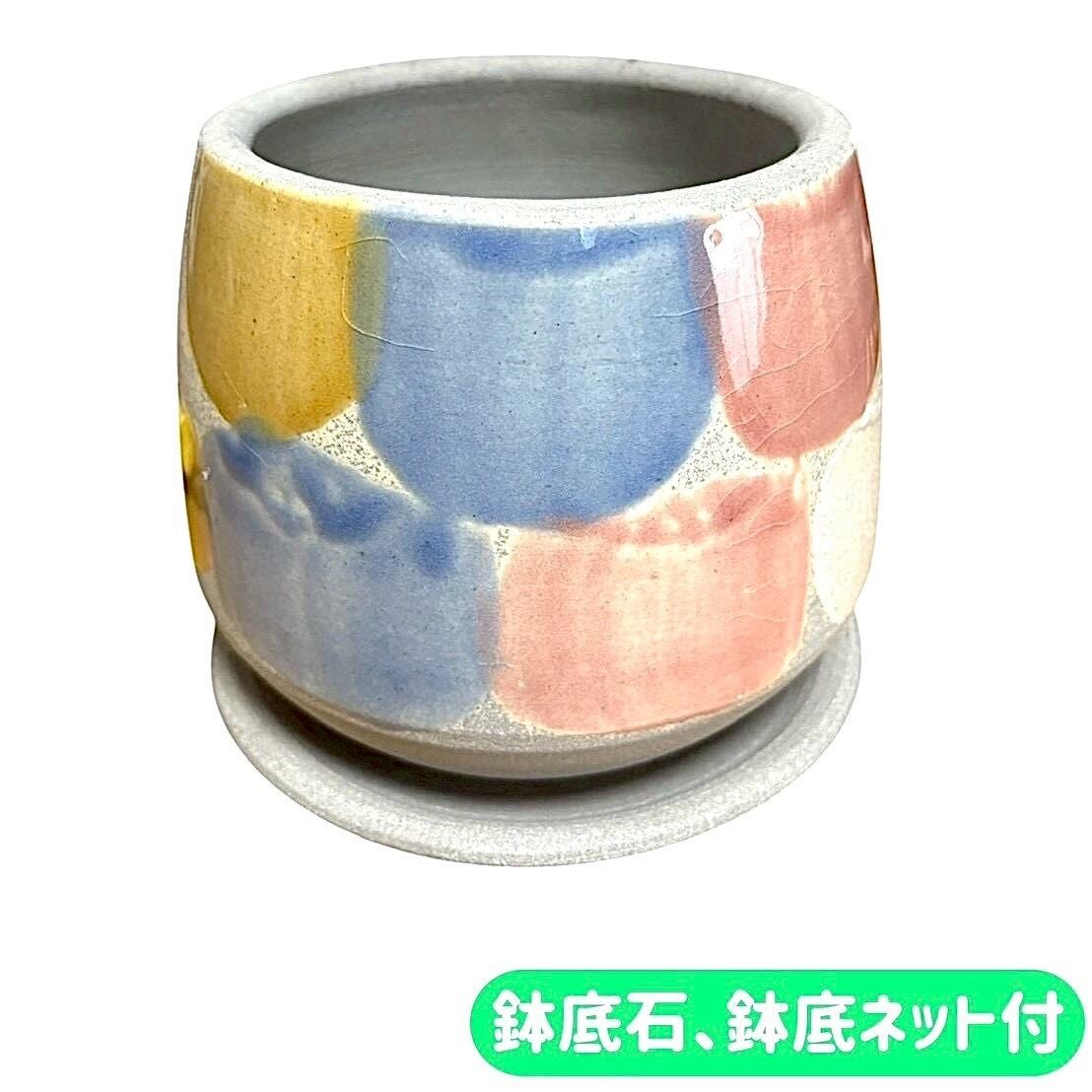 信楽焼に黄色やピンク、青色の釉薬が塗られた