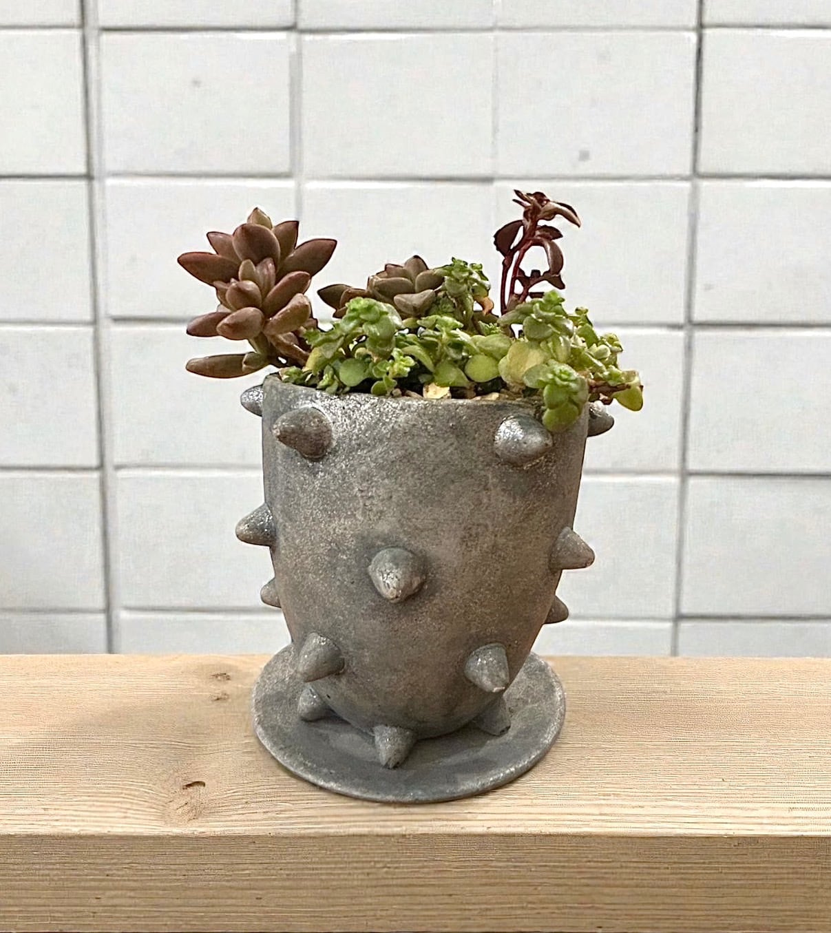 おしゃれなトゲトゲデザインが印象的なグレー色の陶器製植木鉢です。