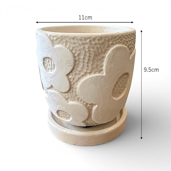 ベージュのシンプルな形をしたセメント製の植木鉢です。シンブルなデザインに白色の花柄が施されていて可愛らしい見た目に仕上がっています。
