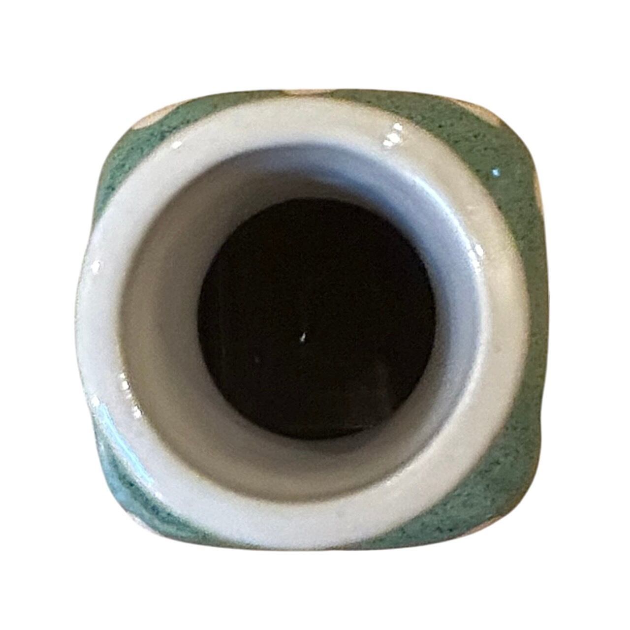 緑色の陶器に東欧風なデザインが施された可愛いらしいデザインのプランターです。