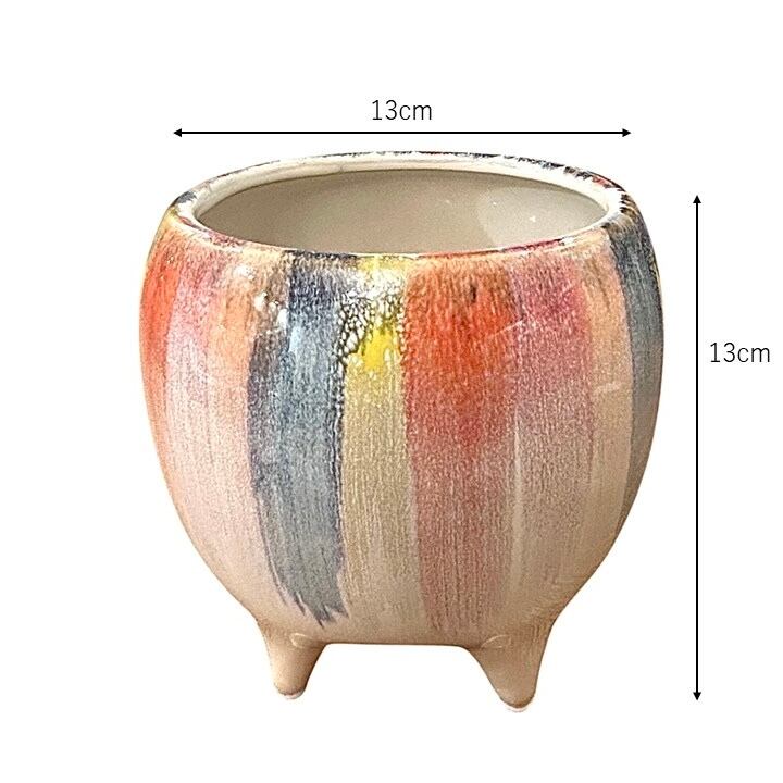 淡い黄色、青、ピンクのグラデーションが魅力の陶器製の植木鉢。