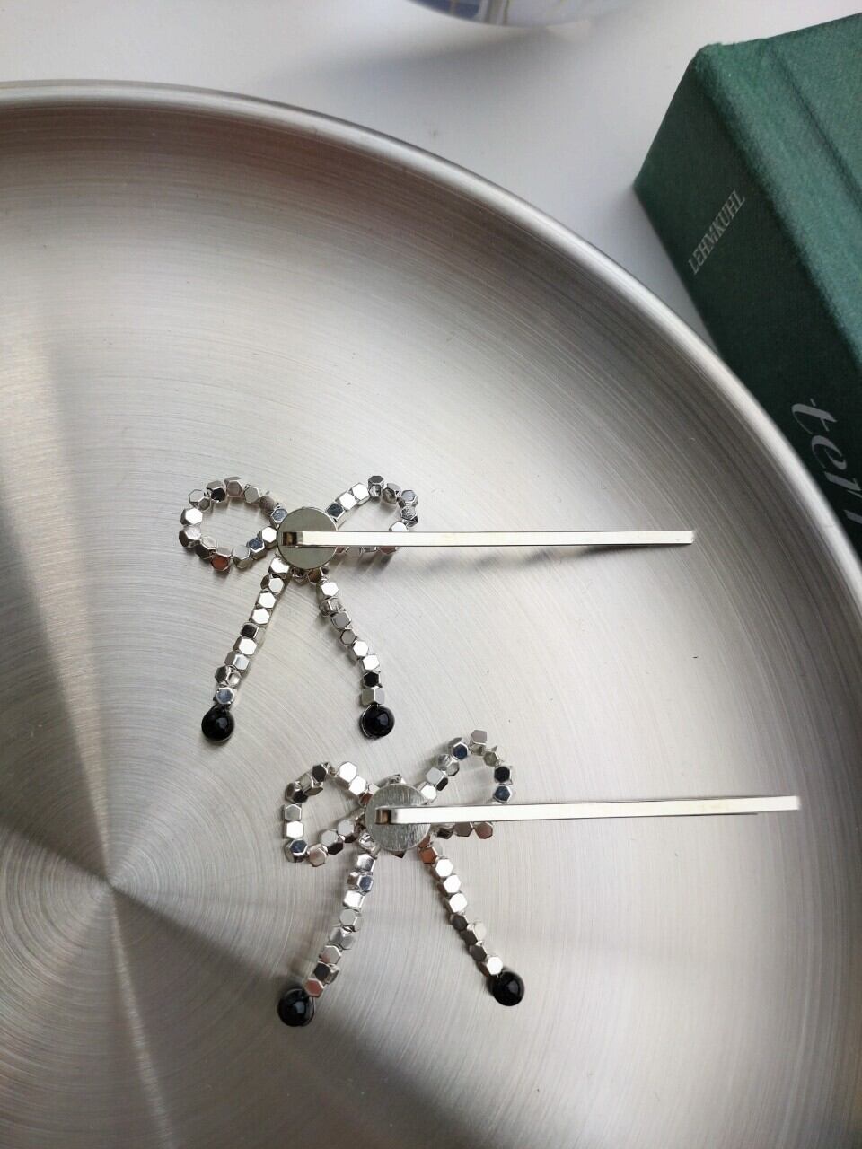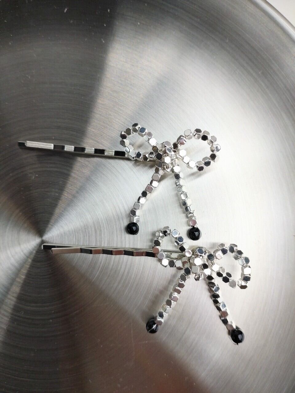 メタルキューブビーズを仕様したリボン型のヘアピンで す♪
