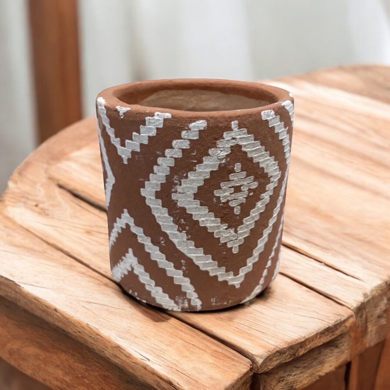 深い茶色に白のラインが入ったアジアンテイストなインテリアポットです。