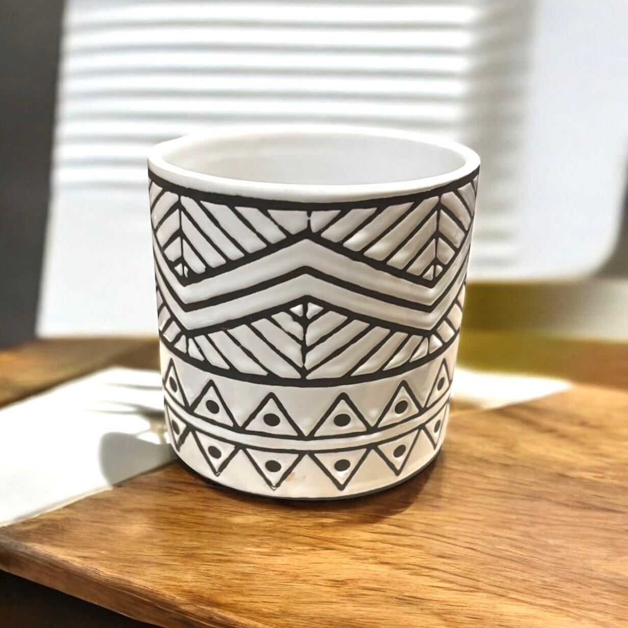 白色に黒色のパターンが施されたスタイリッシュなインテリアポットです。シンプルなデザインながらも、独特なテクスチャーが目を引き、お部屋に洗練された雰囲気を演出します。お好きな植物やドライフラワーを飾ることで、一層魅力的なインテリアのアクセントになります!