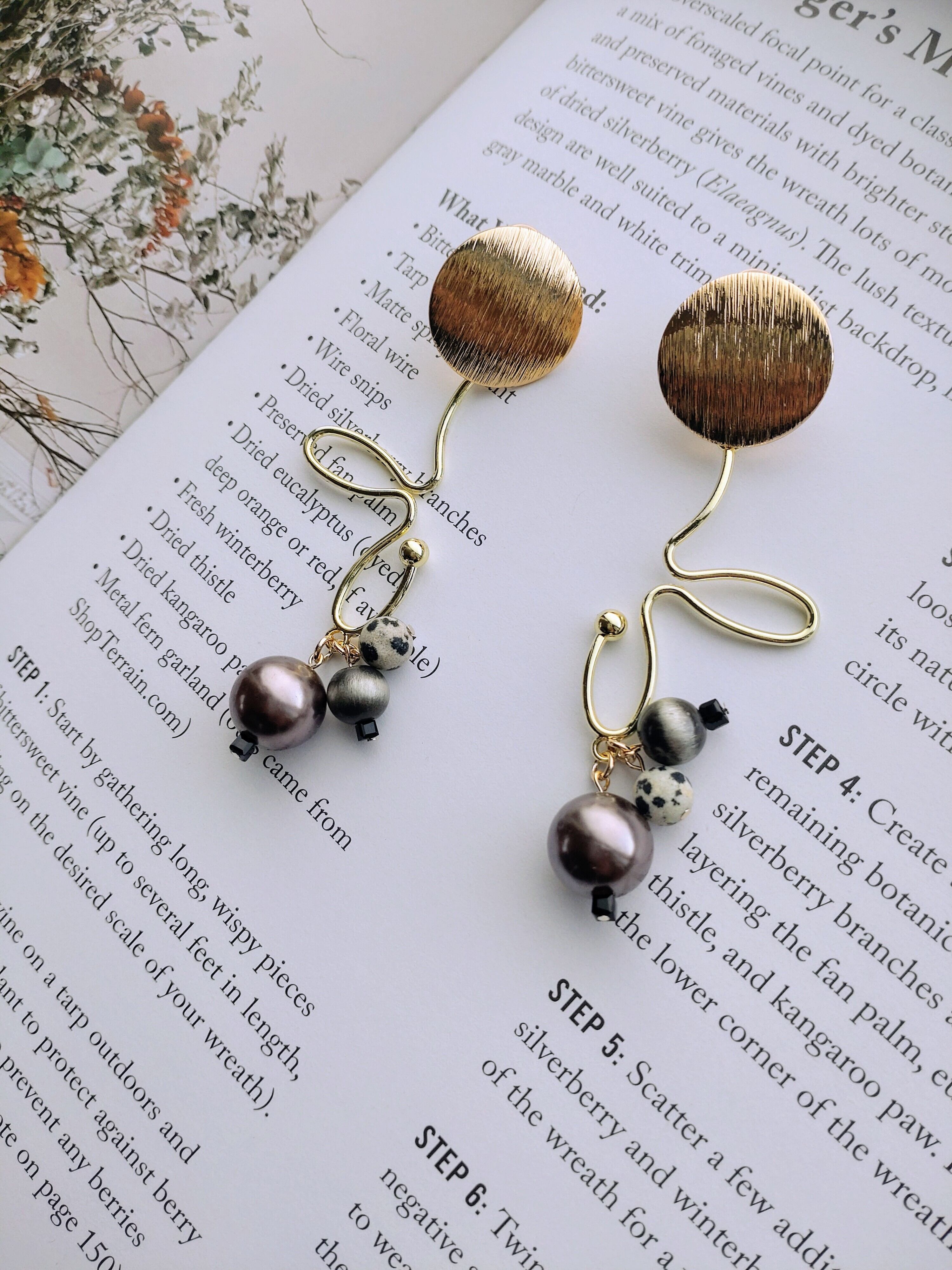 メタリックパールビーズ、グレービーズ、ダルメシアン柄ビーズがゆらゆら可愛いデザインになっています。