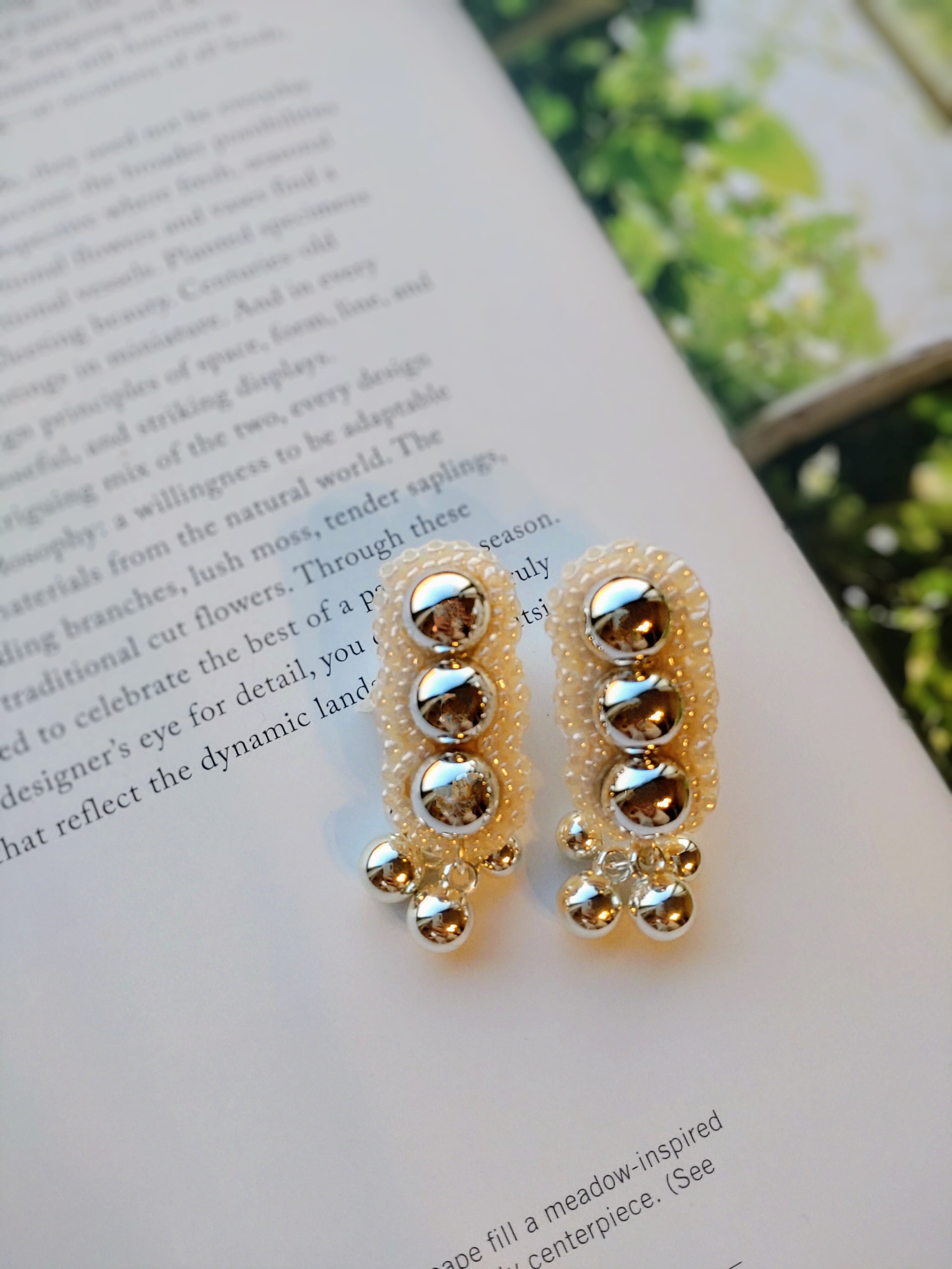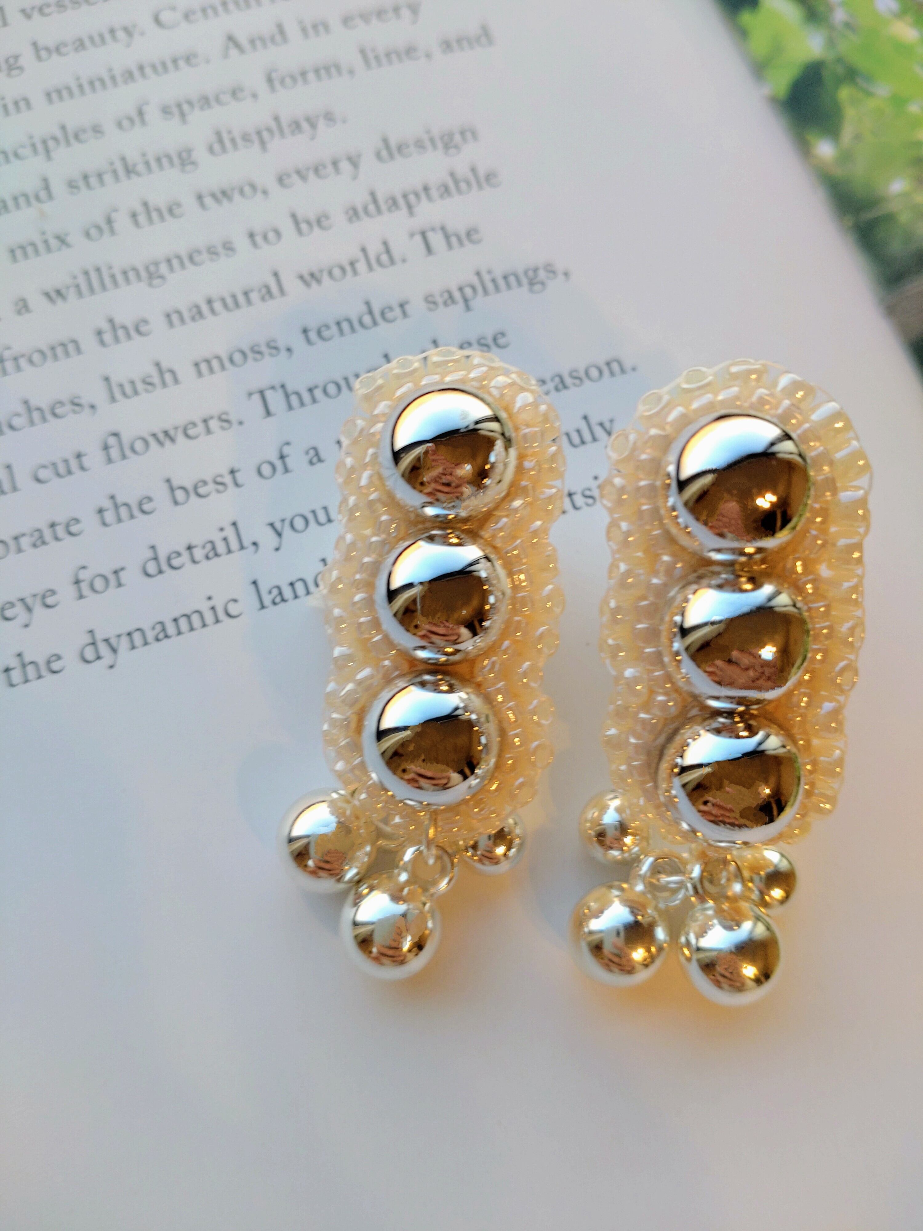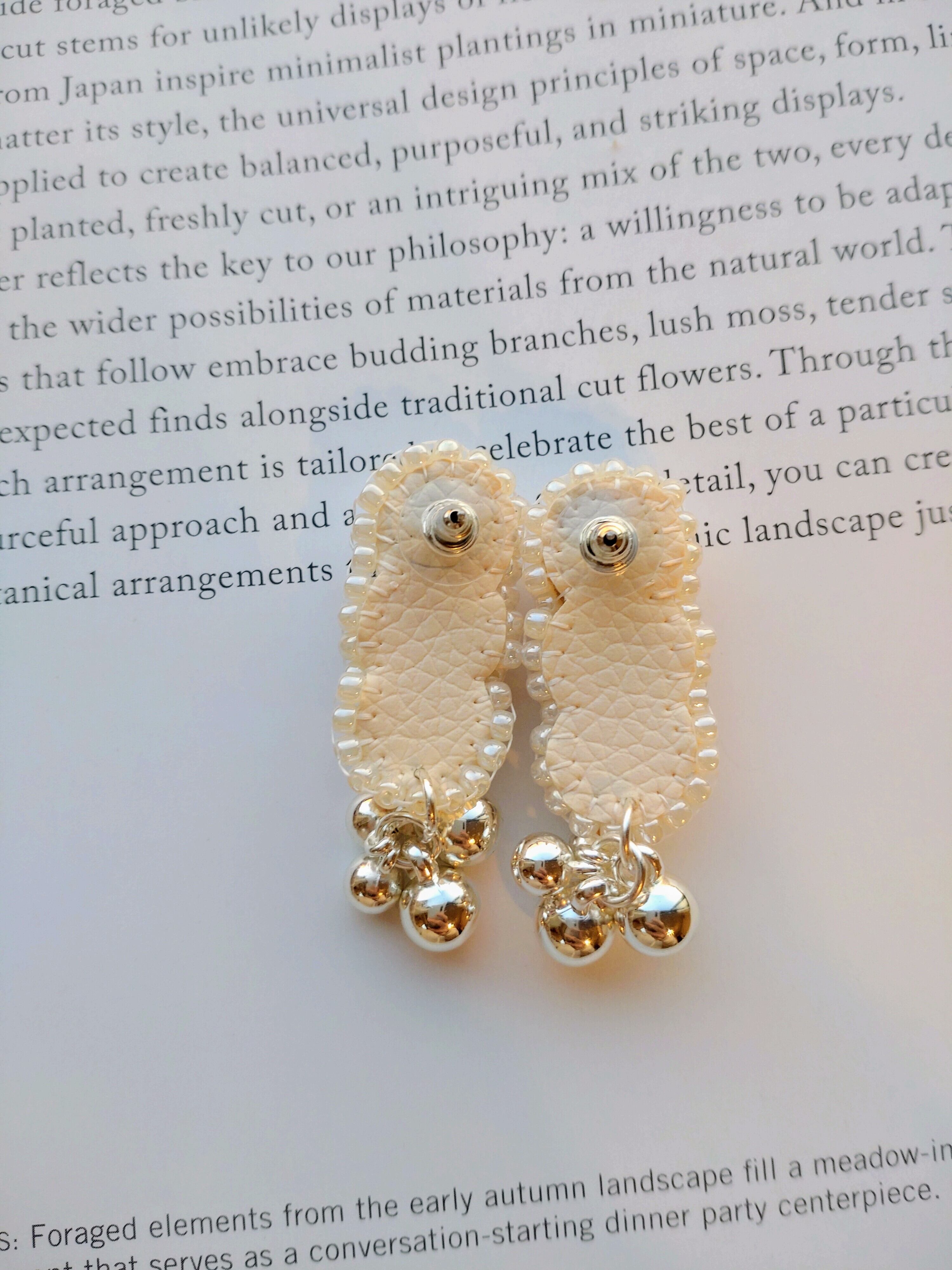 シルバーカボションを3つ並べて、周りをホワイト系ビーズでステッチしたデザインのピアスです。